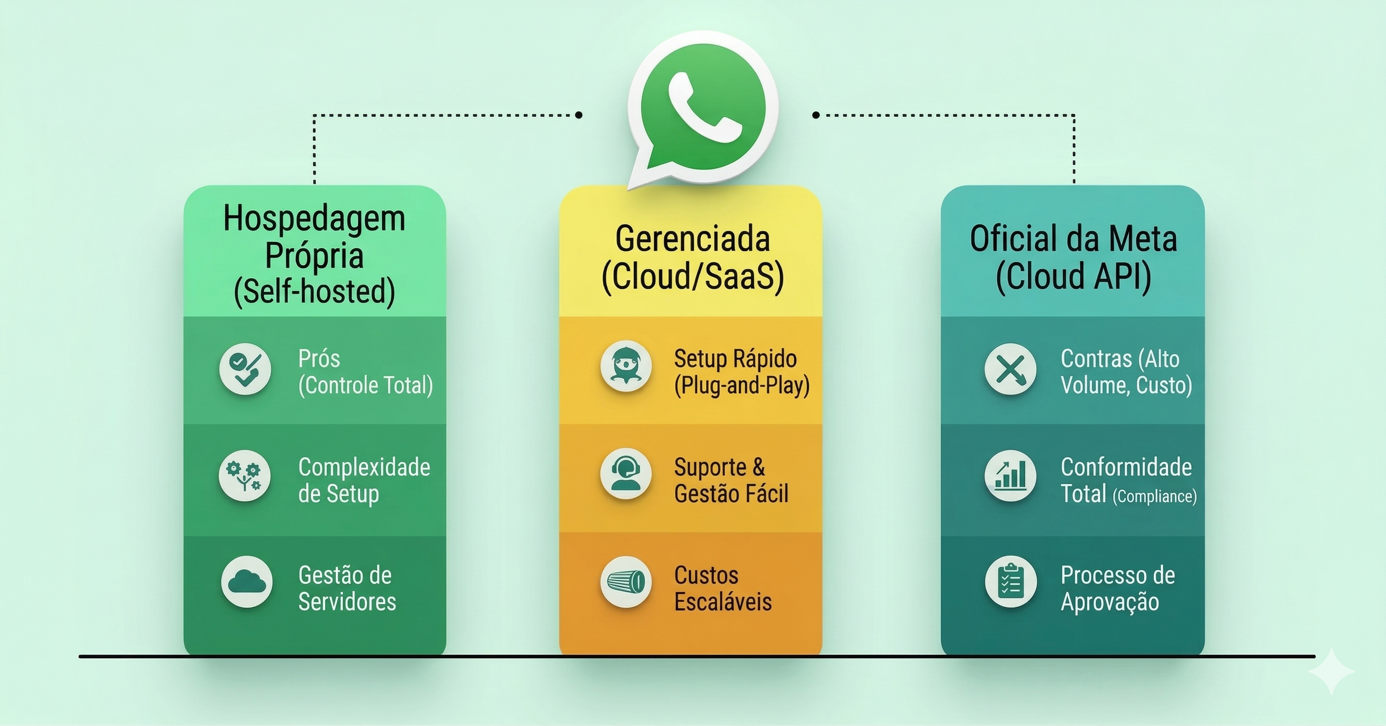 A escolha pelo tipo de integração, self-hosted, gerenciada ou oficial, depende do perfil, objetivo e orçamento do projeto. Em qualquer cenário, recomendamos investir em rotinas automatizadas e processos claros, sempre respeitando boas práticas de segurança, consentimento e governança de dados.